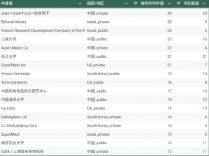 值得注意的是,中国的申请者包括多所大学,例如浙江大学(21项专利族)、江南大学(16项)和中国海洋大学(12项)。这表明政府的“非常强烈”的兴趣以及有意采取协作方式来建设国家细胞农业生态系统。